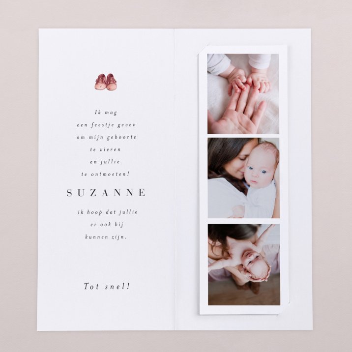 De fotostrip gaat in de binnenkant van de kaart en kan worden opgehangen als decoratie of als boekenlegger worden gebruikt.