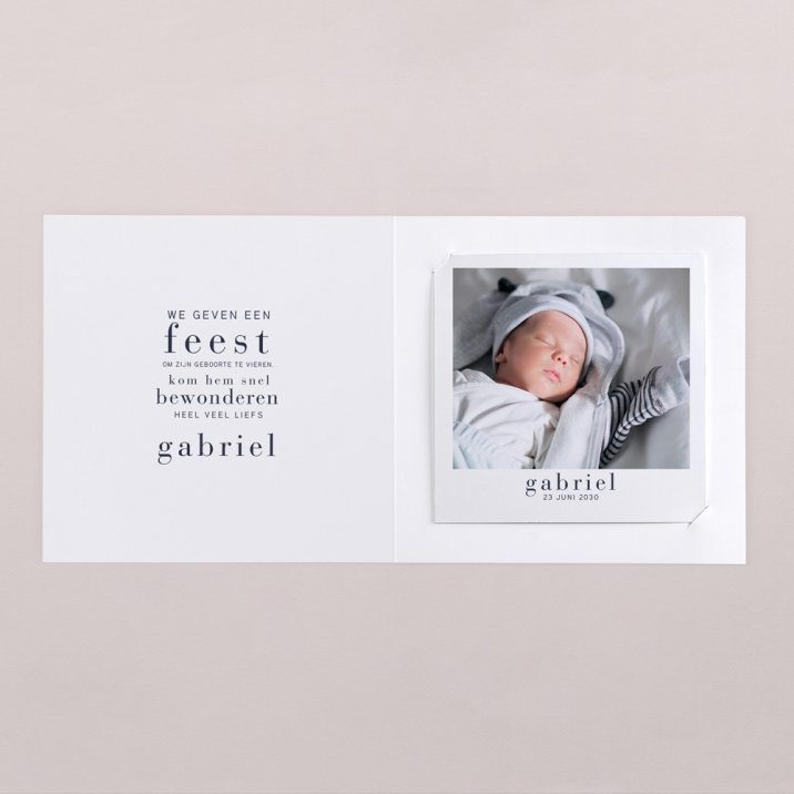 De polaroid gaat in de binnenkant van de kaart en kan daarna ergens apart worden tentoongesteld als herinnering aan de geboorte!