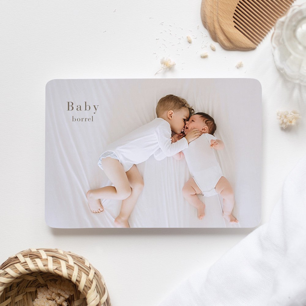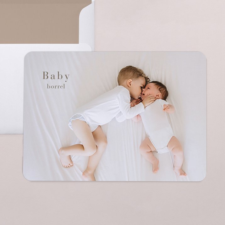 Een simpel en trendy uitnodiging met afgeronde hoeken. Model hier gepresenteerd met bijbehorende binnenkant envelop en sticker (extra te bestellen, zie hieronder)