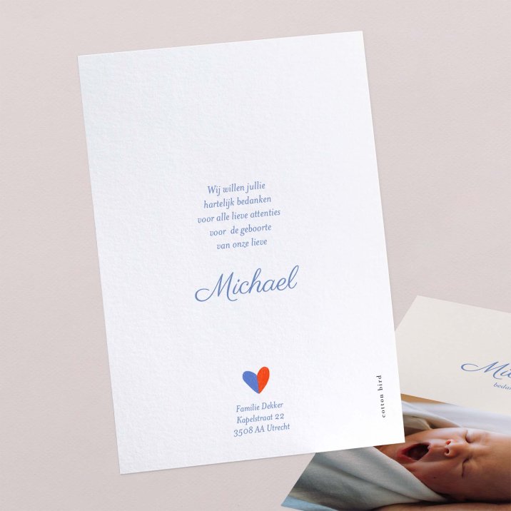 Dit kleine kaartje is als uitnodiging of bedankkaartje te verzenden. Dubbelzijdig en staand formaat met aan een kant je foto en aan de andere kant je tekst.