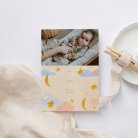 – Kleur: geel, blauw, roze, goud, beige – Thema: chic, origineel, hemellichamen – Illustraties: sterren, maan, wolken
