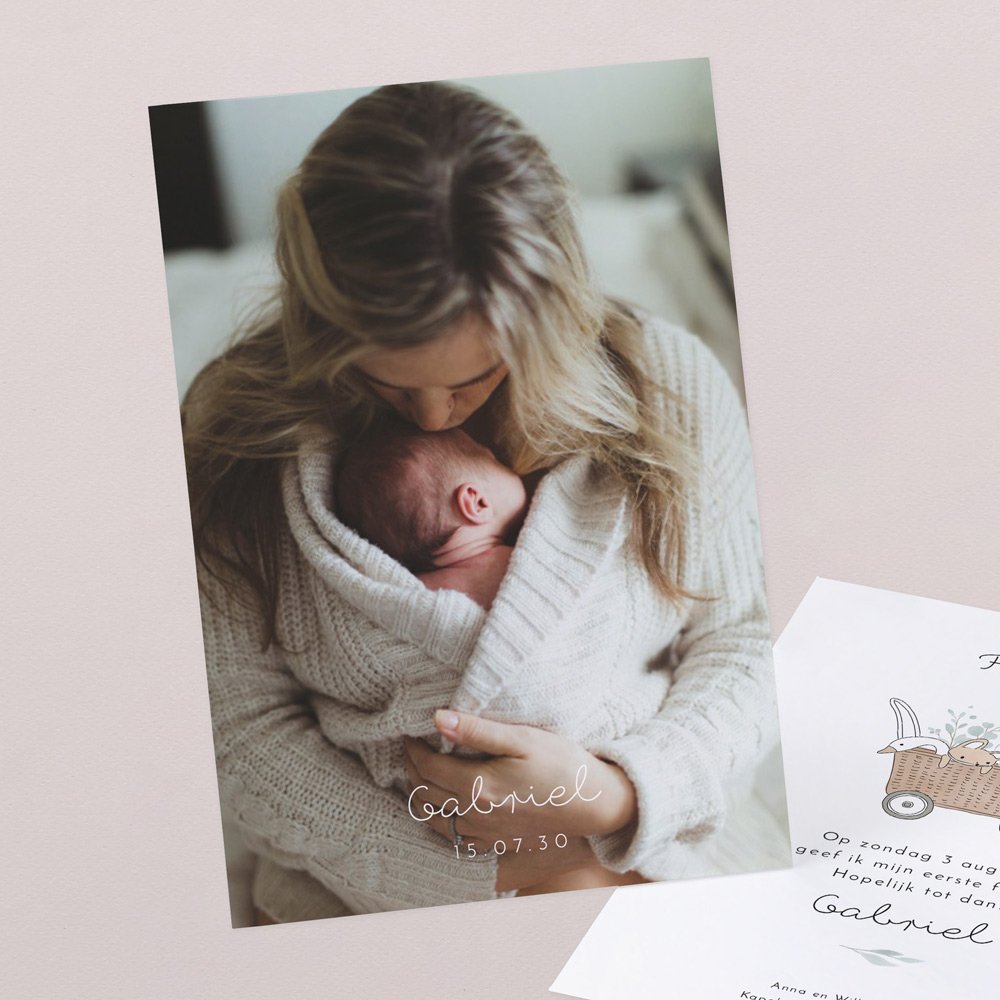 Dit kleine kaartje is als uitnodiging of bedankkaartje te verzenden. Dubbelzijdig en staand formaat met aan een kant je foto en aan de andere kant je tekst.