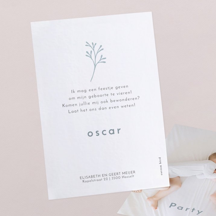 Dit kleine kaartje is als uitnodiging of bedankkaartje te verzenden. Dubbelzijdig en staand formaat met aan een kant je foto en aan de andere kant je tekst.