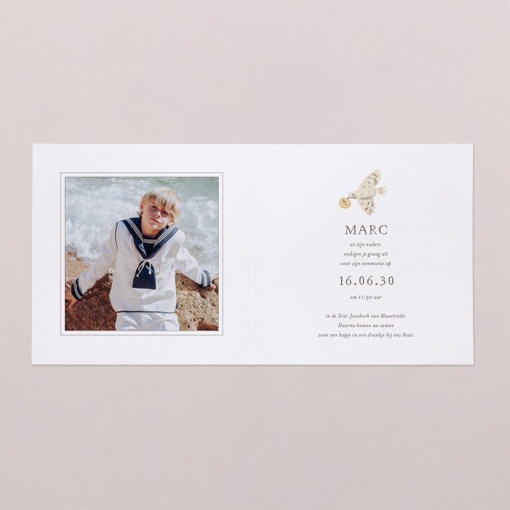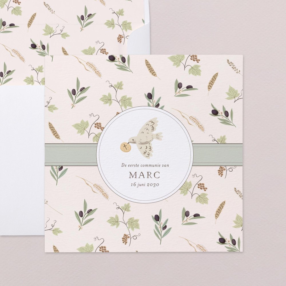Symbool voor bescherming en overvloed, omringen de olijftakjes, granen en druivenblaadjes de naam van je kind. De communiekaart Nathan en zijn zachte illustratie van een vredesduif kondigt het plechtig moment aan van samenzijn rond de Heilige communie of heugelijk lentefeest van je dochter of zoon.