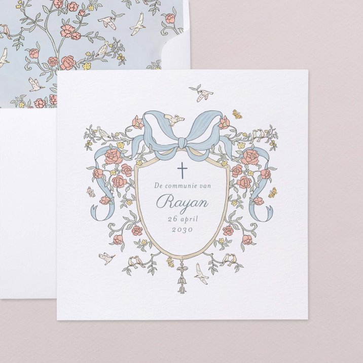 De naam van uw kind staat centraal in een delicaat bloemenontwerp in roze en geel, tot leven gebracht door schattige vlinders en vogels. Een unieke creatie met vintage details – perfect om de Eerste Communie van uw kind op een bijzondere manier aan te kondigen.