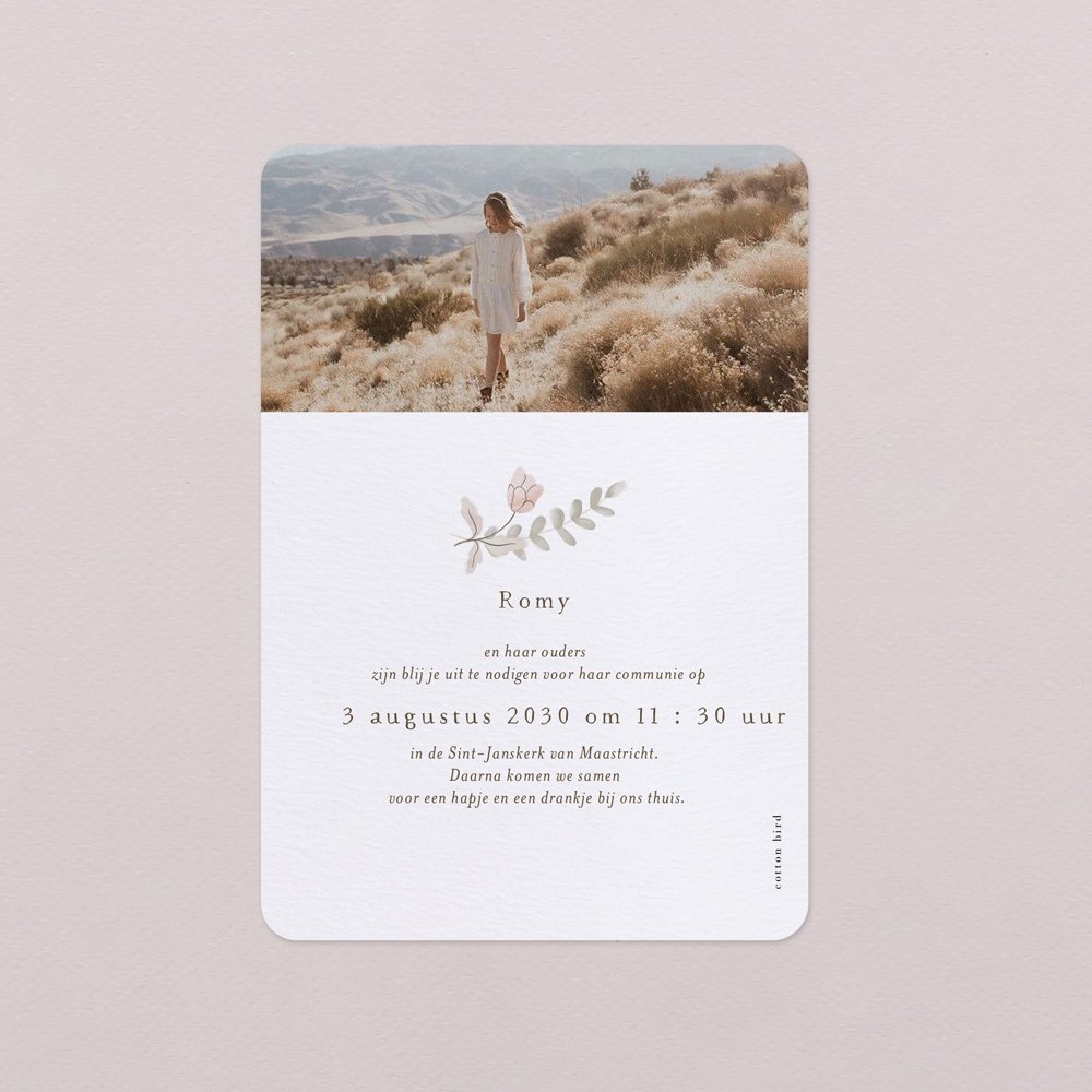 Een simpel en trendy uitnodiging voor een communie of lentefeest met afgeronde hoeken, dubbelzijdig en staand formaat.