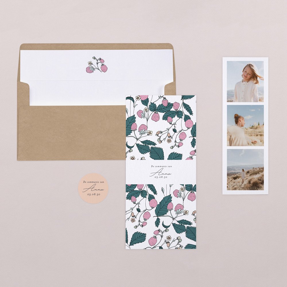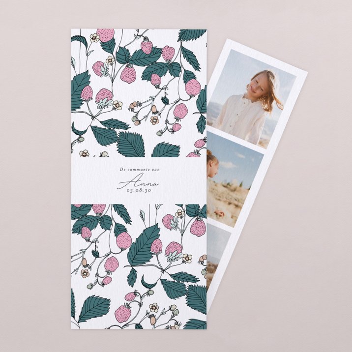Kondig de communie van je kind op een frisse manier aan met de Wild Strawberry II uitnodiging! De zomerse illustraties en fantasierijke kleuren zijn perfect voor een communie of lentefeest gepland voor het warme seizoen.