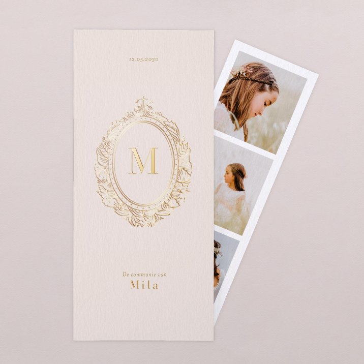 Sierlijke ornamenten in goudfolie omringen de eerste letter van de naam. Een feestelijke chique uitnodiging kondigt het bijzondere gebeuren van de heilige communie of vormsel aan bij familie en vrienden.