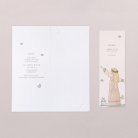 Bij het openvouwen van deze originele dubbele communiekaart, ontdekt iedereen de prachtige communiefoto’s op een aparte fotostrip, samengaand met de datum en een persoonlijk berichtje ter herinnering van dit plechtig moment van een lentefeest, heilige of plechtige communie.