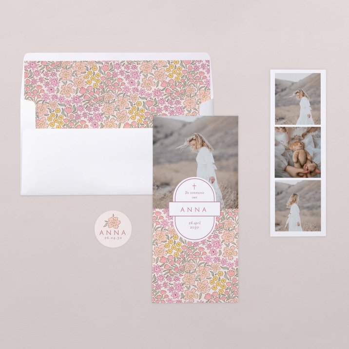 Bij het openvouwen van deze originele dubbele communiekaart, ontdekt iedereen de prachtige communiefoto’s op een aparte fotostrip, samengaand met de datum en een persoonlijk berichtje ter herinnering van dit plechtig moment van een lentefeest, heilige of plechtige communie.