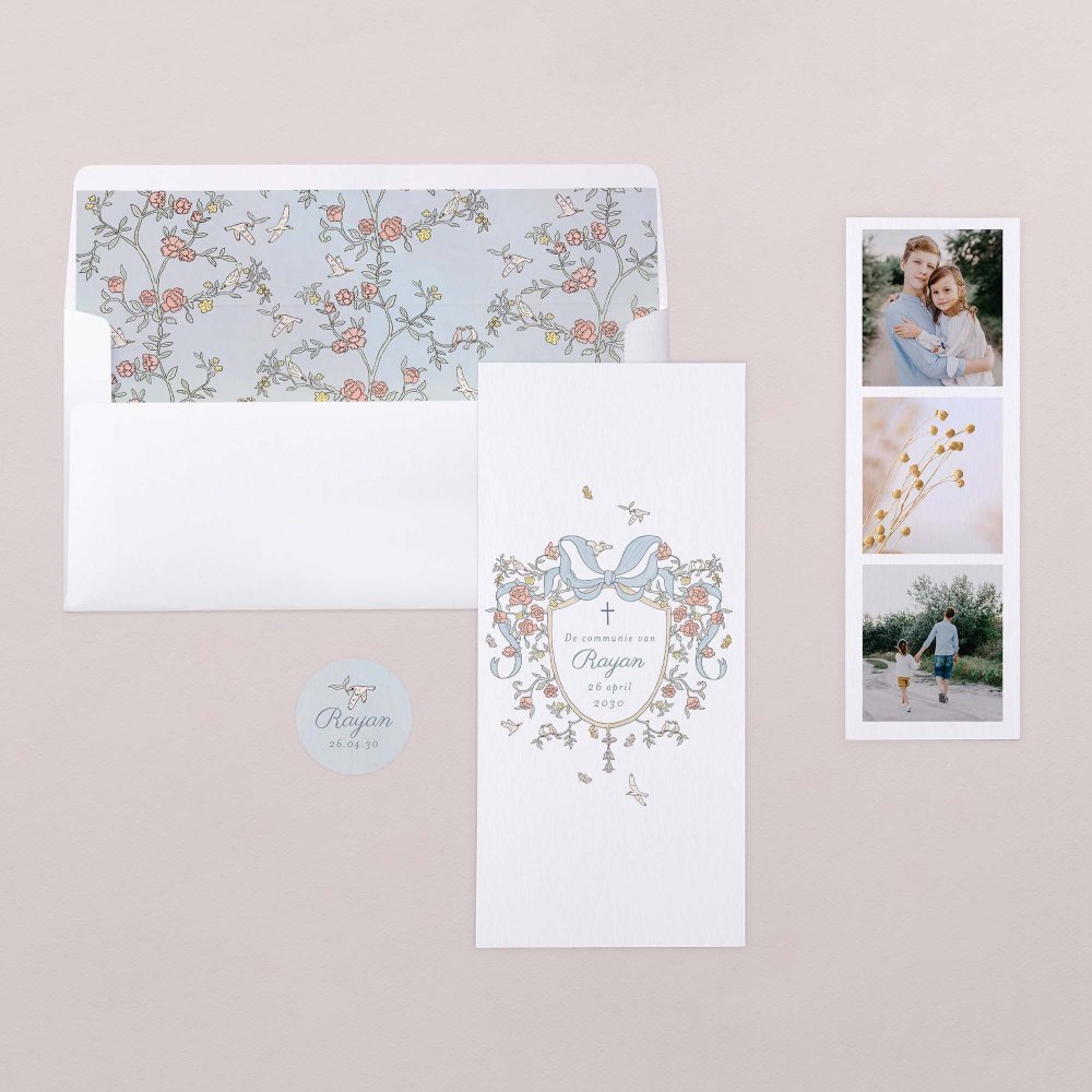 Bij het openvouwen van deze originele dubbele communiekaart, ontdekt iedereen de prachtige communiefoto’s op een aparte fotostrip, samengaand met de datum en een persoonlijk berichtje ter herinnering van dit plechtig moment van een lentefeest, heilige of plechtige communie.