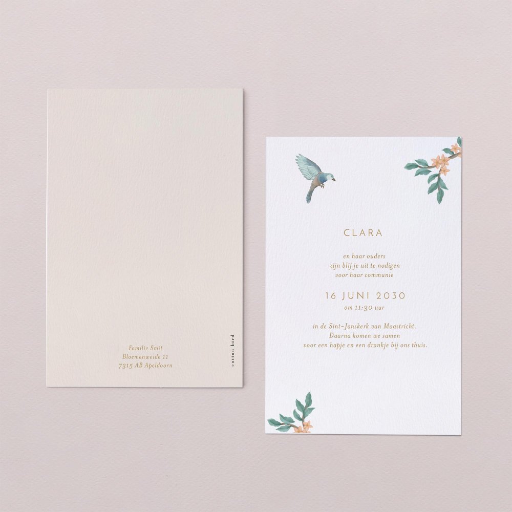 Bloesems kondigen de lente aan, een nieuw begin van groeien en bloeien, in gezelschap van teder gekleurde vogeltjes. Dit po?tisch tafereel kondigt een bijzonder gebeuren aan in het Christelijke leven van je kind. De communiekaart Vredig nodigt familie en vrienden uit voor een heugelijk moment van samenzijn.