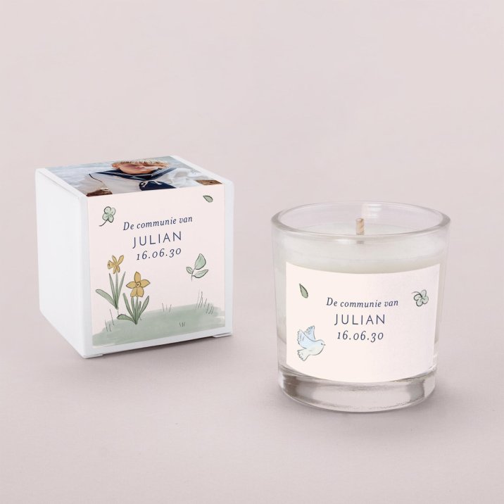 Bied je gasten een mooi geurende en gepersonaliseerde kaars aan. Een lieve attentie om te geven aan familie en vrienden op de dag van het communie of lentefeest.