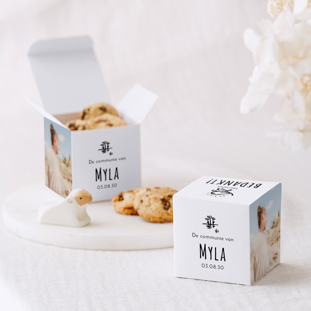 Een verrassingsdoosje als cadeautje voor je familie en vrienden, een mooie herinnering aan de communie of lentefeest van jullie kind. Een kleine kubus van 5,4 x 5,4 cm waarin verschillende soorten lekkernijen kunnen. Laat je creativiteit de vrije loop!