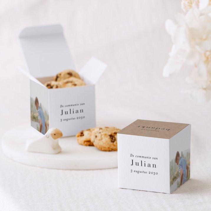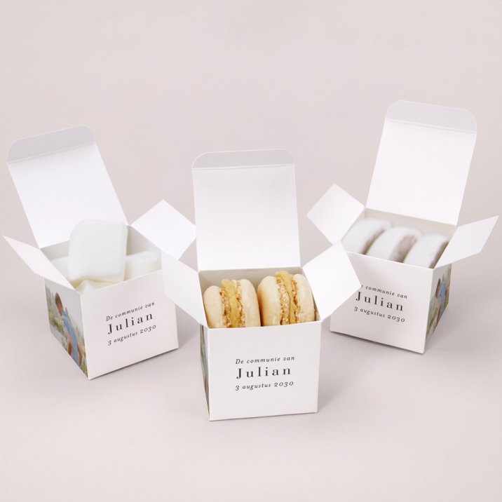 Een verrassingsdoosje als cadeautje voor je familie en vrienden, een mooie herinnering aan de communie of lentefeest van jullie kind. Een kleine kubus van 5,4 x 5,4 cm waarin verschillende soorten lekkernijen kunnen. Laat je creativiteit de vrije loop!