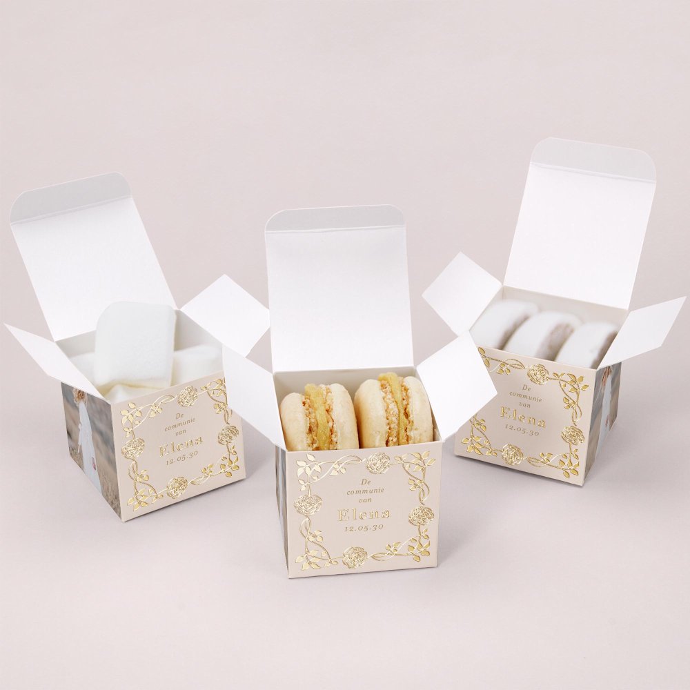Een verrassingsdoosje als cadeautje voor je familie en vrienden, een mooie herinnering aan de communie of lentefeest van jullie kind. Een kleine kubus van 5,4 x 5,4 cm waarin verschillende soorten lekkernijen kunnen. Laat je creativiteit de vrije loop!