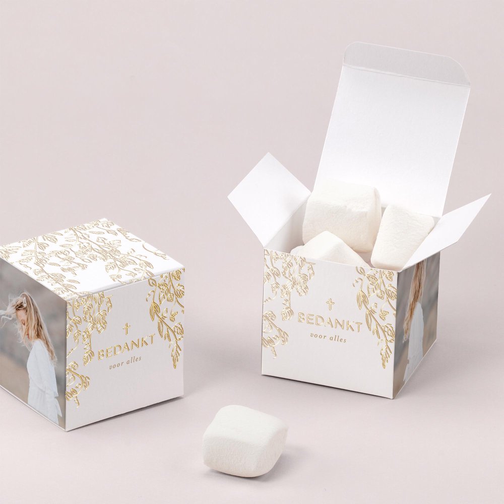 Een verrassingsdoosje als cadeautje voor je familie en vrienden, een mooie herinnering aan de communie of lentefeest van jullie kind. Een kleine kubus van 5,4 x 5,4 cm waarin verschillende soorten lekkernijen kunnen. Laat je creativiteit de vrije loop!