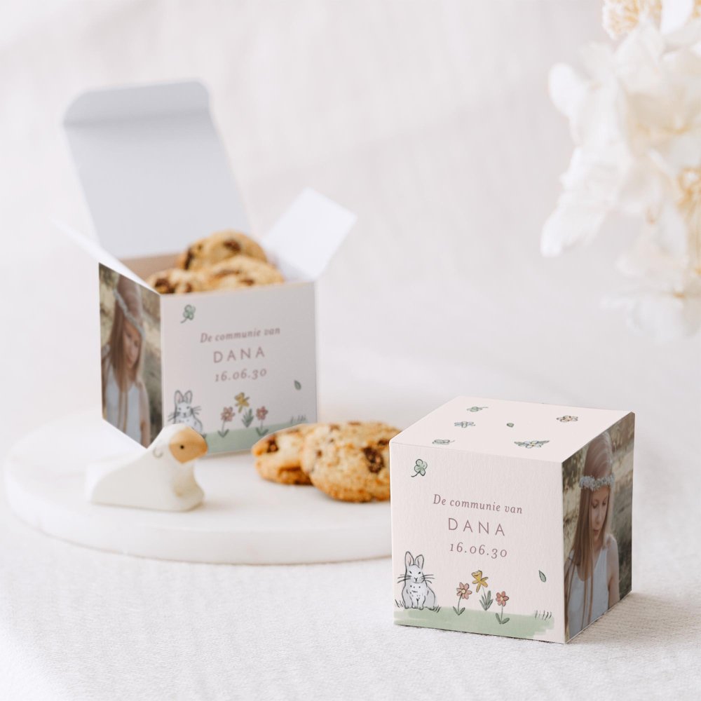 Een verrassingsdoosje als cadeautje voor je familie en vrienden, een mooie herinnering aan de communie of lentefeest van jullie kind. Een kleine kubus van 5,4 x 5,4 cm waarin verschillende soorten lekkernijen kunnen. Laat je creativiteit de vrije loop!