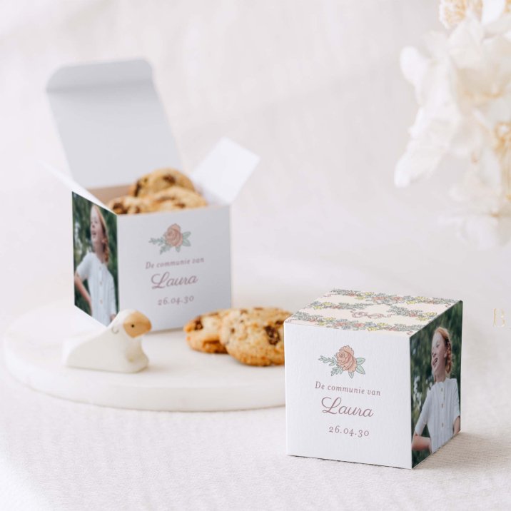 Een verrassingsdoosje als cadeautje voor je familie en vrienden, een mooie herinnering aan de communie of lentefeest van jullie kind. Een kleine kubus van 5,4 x 5,4 cm waarin verschillende soorten lekkernijen kunnen. Laat je creativiteit de vrije loop!