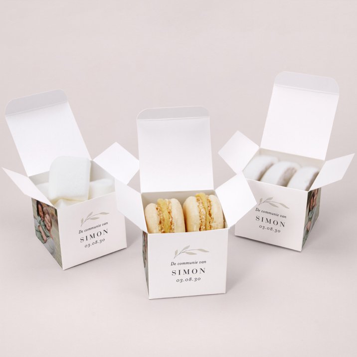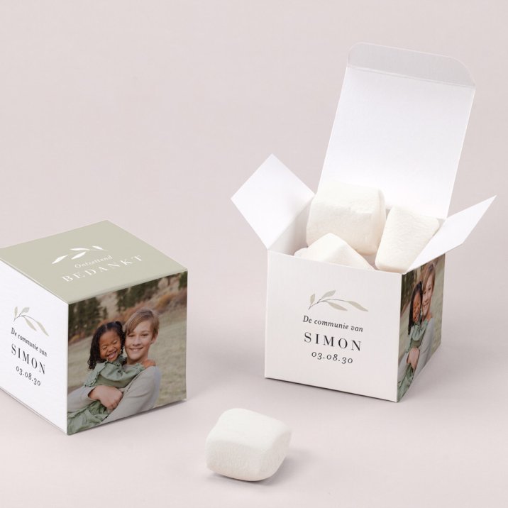 Een verrassingsdoosje als cadeautje voor je familie en vrienden, een mooie herinnering aan de communie of lentefeest van jullie kind. Een kleine kubus van 5,4 x 5,4 cm waarin verschillende soorten lekkernijen kunnen. Laat je creativiteit de vrije loop!