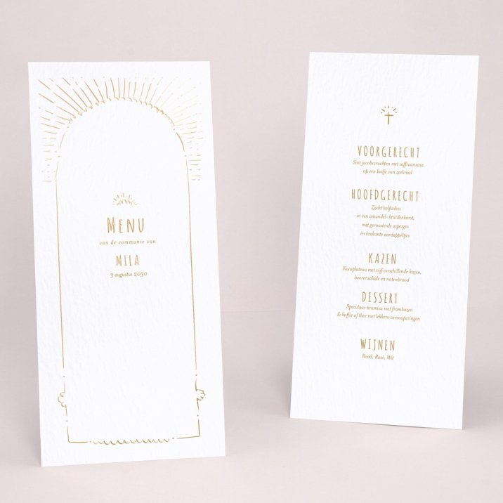 De menukaaren zijn natuurlijk in dezelfde stijl als de uitnodigingen van het communie of lentefeest.