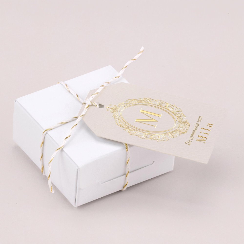 Deze cadeaulabels zijn ideaal voor de communiebedankjes. Dankzij de perforatie kan je er moeiteloos een lintje doorrijgen en bevestigen aan een snoepdoosje of ander klein cadeautje. (lintje optioneel naar keuze)