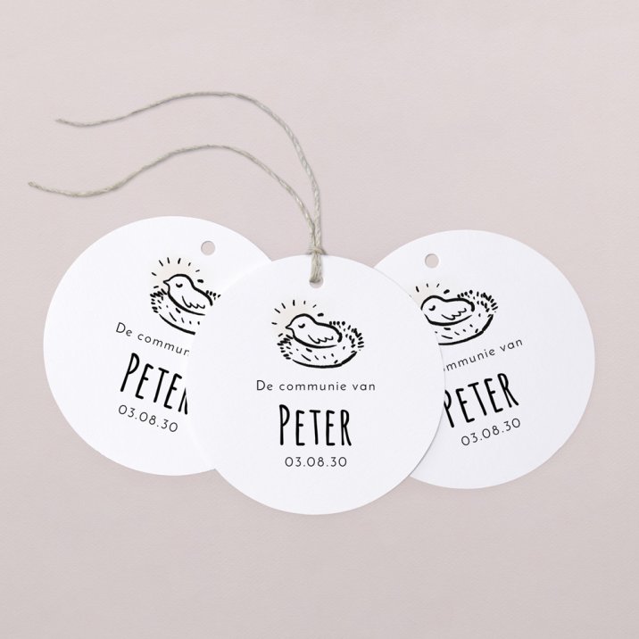 Deze ronde cadeaulabels zijn ideaal voor communiebedankjes. Dankzij de perforatie kan je er moeiteloos een lintje doorrijgen en bevestigen aan een snoepdoosje of ander klein cadeautje. (lintje optioneel naar keuze)