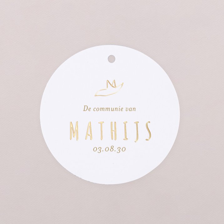 Deze ronde cadeaulabels zijn ideaal voor communiebedankjes. Dankzij de perforatie kan je er moeiteloos een lintje doorrijgen en bevestigen aan een snoepdoosje of ander klein cadeautje. (lintje optioneel naar keuze)