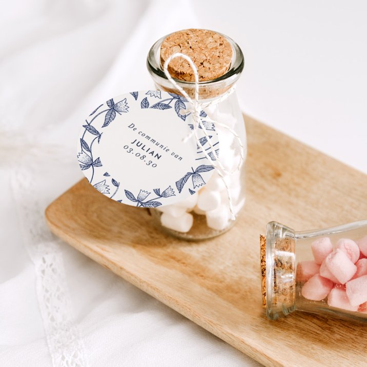 Deze ronde cadeaulabels zijn ideaal voor communiebedankjes. Dankzij de perforatie kan je er moeiteloos een lintje doorrijgen en bevestigen aan een snoepdoosje of ander klein cadeautje. (lintje optioneel naar keuze)