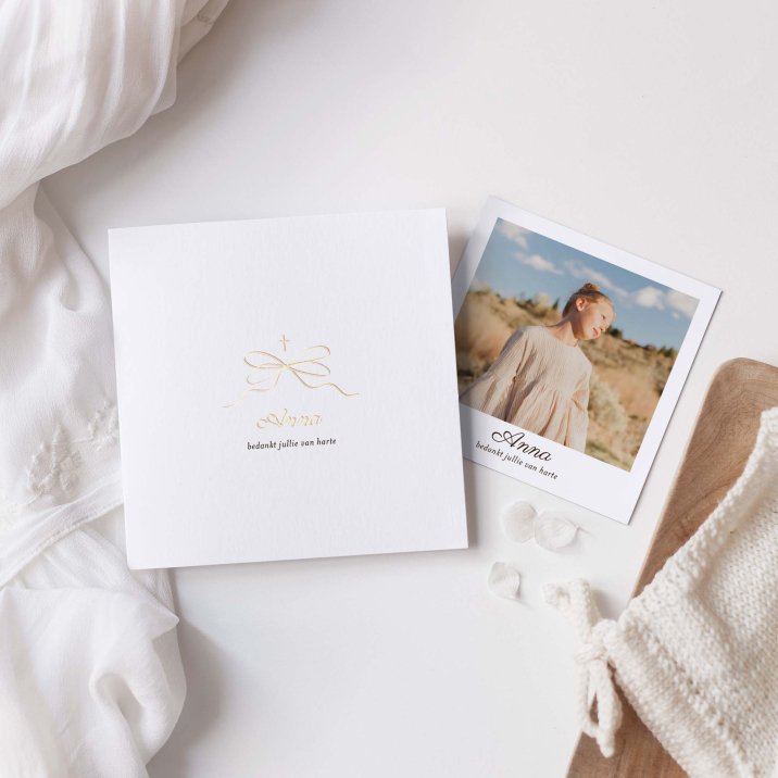 Bedank de familieleden die aanwezig waren bij de communie van je kind met een mooie, persoonlijke kaart. Bij deze bedankkaart zit een cadeautje verstopt in de kaart: een polaroid (niet-magnetisch) van je kind die ze naar wens kunnen ophangen, in een fotoalbum kunnen stoppen, als bladwijzer kunnen gebruiken...