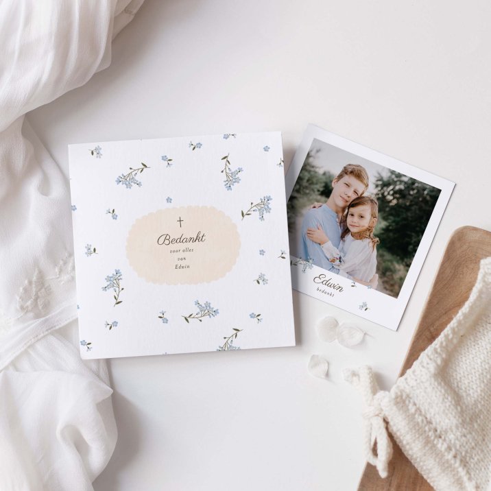 Bedank de familieleden die aanwezig waren bij de communie van je kind met een mooie, persoonlijke kaart. Bij deze bedankkaart zit een cadeautje verstopt in de kaart: een polaroid (niet-magnetisch) van je kind die ze naar wens kunnen ophangen, in een fotoalbum kunnen stoppen, als bladwijzer kunnen gebruiken...