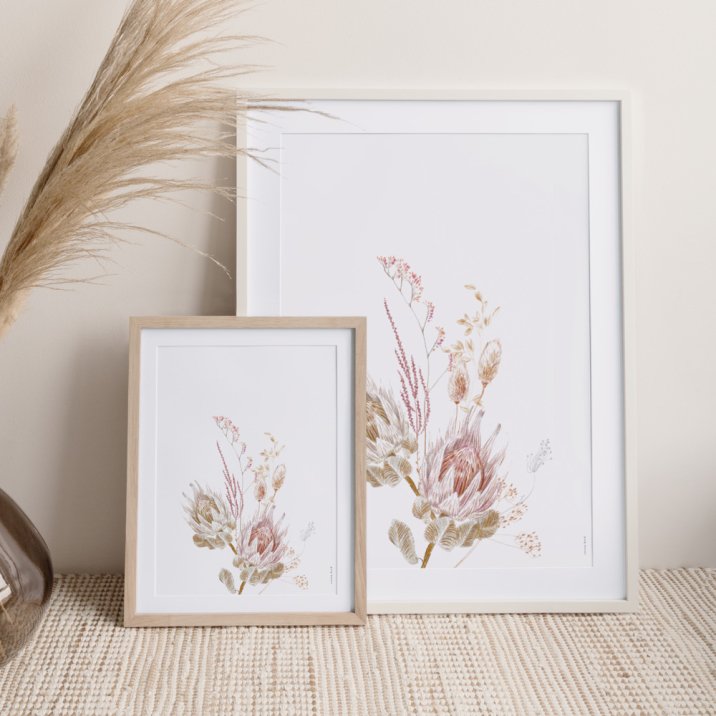 Helemaal trendy! Gedroogde bloemen fleuren elke elk hoekje van je huis op. Laat je muren stralen met deze poster Protéa en zijn zachte botanische illustratie.