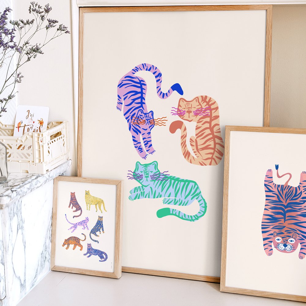 Breng pit in de slaapkamerinrichting van je kind met de poster Pop tigers. Geïllustreerd in een flitsend kleurenpalet, dit trio van tijgers waakt trots over je kleine uk.