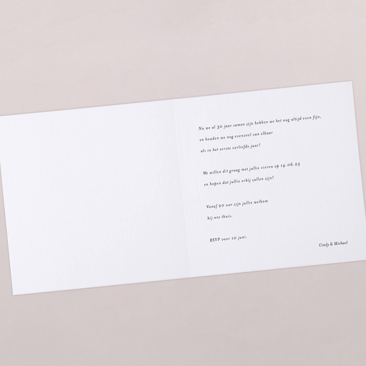 Nodig jullie gasten uit voor jullie huwelijksjubileum met een eenvoudig pure jubileumkaart die jullie trouwfoto volledig tot zijn recht laat komen.