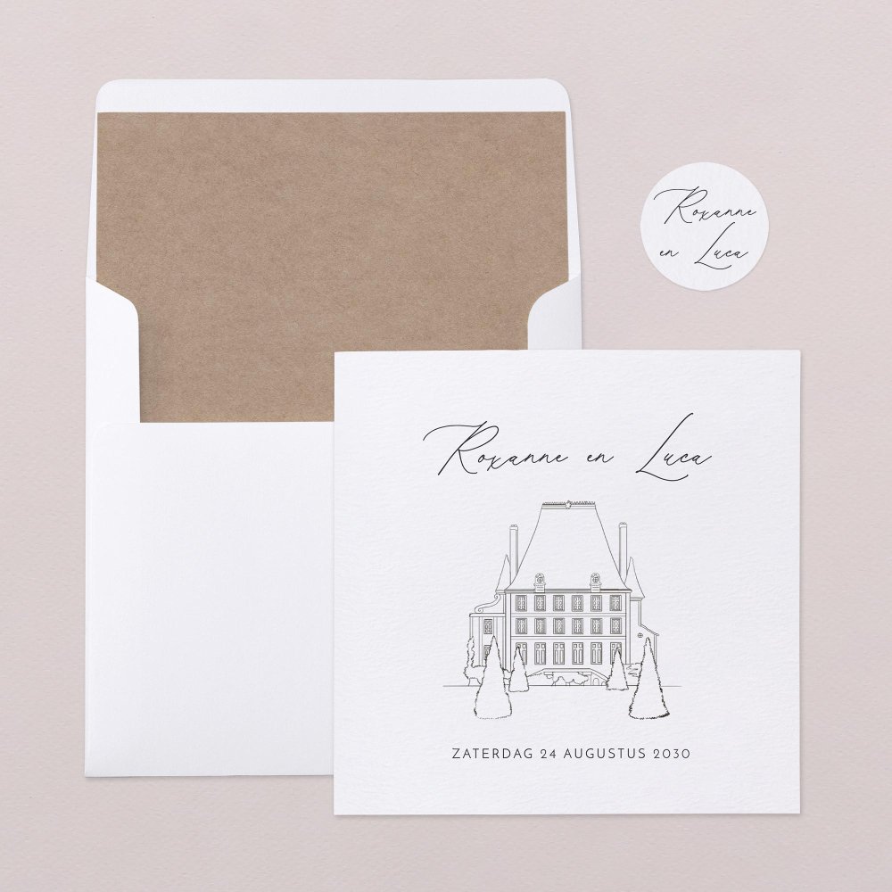 Elegantie en eenvoud komen samen op de trouwkaart Flaubert. Met zijn strakke lijnen en jullie namen, verfraaid met verfijnde kalligrafie, voorspelt dit ontwerp een chique bruiloft die je niet mag missen."