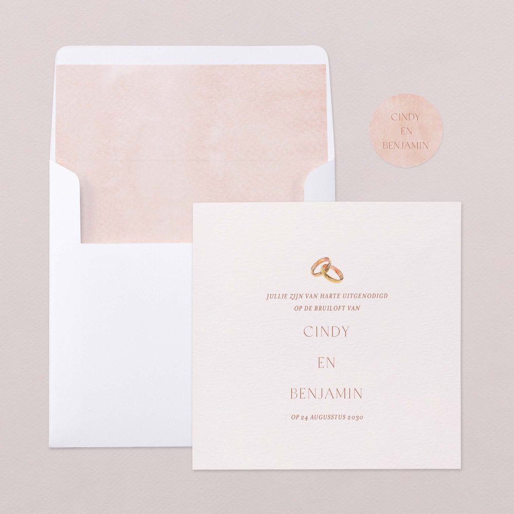 Twee met elkaar verbonden gouden ringen sieren de trouwuitnodiging Eternal Love en symboliseren op stijlvolle wijze de verbinding van twee zielen. Dit minimalistische en elegante ontwerp richt de aandacht op het belangrijkste: de viering van jullie liefde.