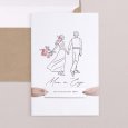 Hand in hand en met liefdevolle details getekend, toont de trouwuitnodiging Ritournelle het bruidspaar in een verfijnde, poëtische illustratie. Accenten met bloemen en een natuurlijke stijl maken deze kaart perfect voor een ontspannen, elegante boho-bruiloft.