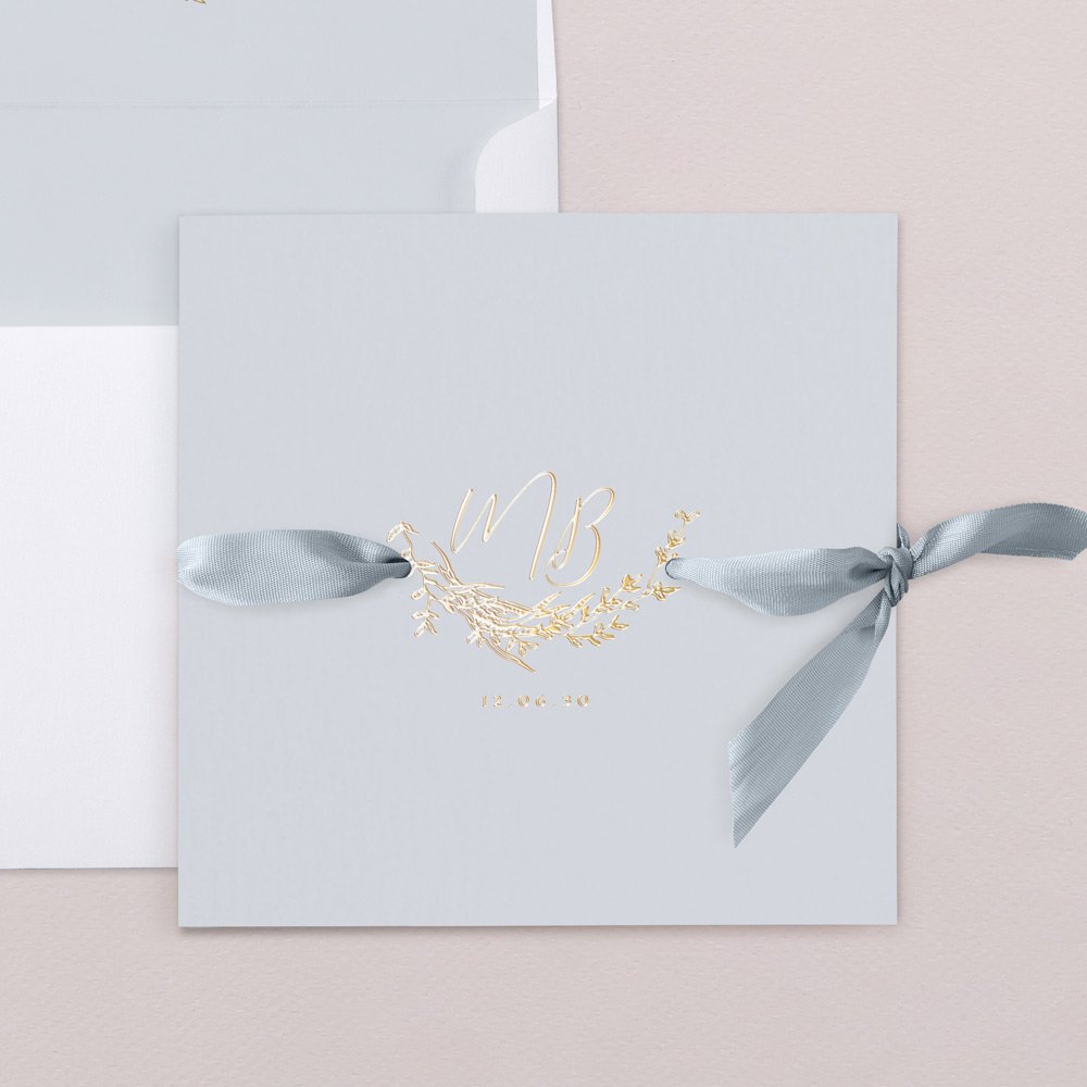 De kaart is versierd met een elegant blauwgrijs lintje van taft (optioneel).