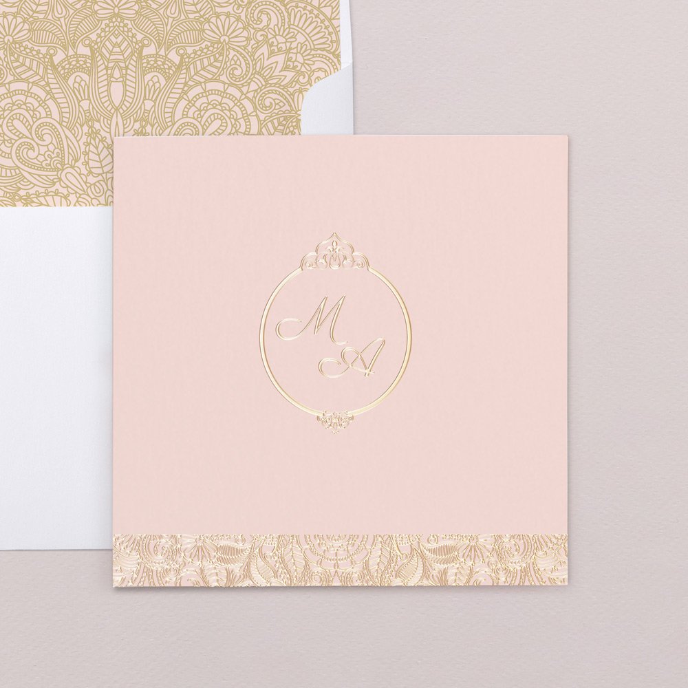 Oosterse tinten met deze prachtige arabesken in goudfolie, ideaal voor een elegant en chic huwelijk. Geef een eerste sfeerbeeld mee van jullie aanstaande trouwdag met het model Olympias.