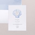 Met een subtiel geschetste schelp in blauwtinten is de trouwkaart Calypso perfect voor de aankondiging van een ceremonie aan zee in het hoogseizoen.