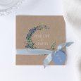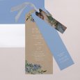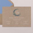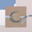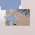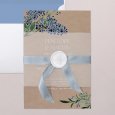 Een bloemrijke boog in blauwe tinten, namen gekleed in verfijnde typografie, kraftachtig papier: de trouwkaart Azzura kondigt een plattelandse viering aan die je niet mag missen.