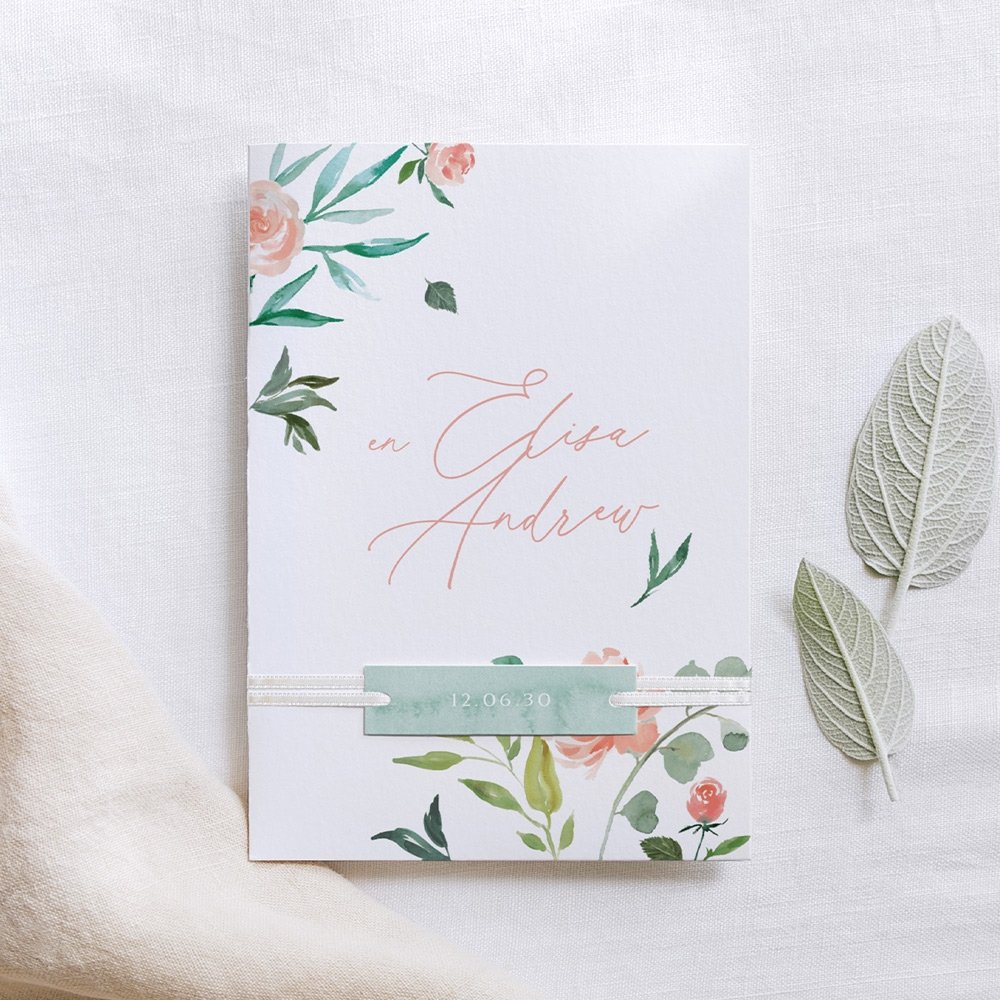 Trouwkaart in de vorm van een hoesje. Deze trouwkaart bevat 1 uitnodiging, 1 boekenlegger, 1 klein labeltje en 2 kleine kaartjes die je zelf kan personaliseren naargelang jullie wensen (dagprogramma, nuttige adressen, routebeschrijving, brunch voor de volgende ochtend...). De 3 kaartjes worden in de binnenkant van het hoesje geplaatst, afgesloten met een lintje naar keuze (extra te bestellen).