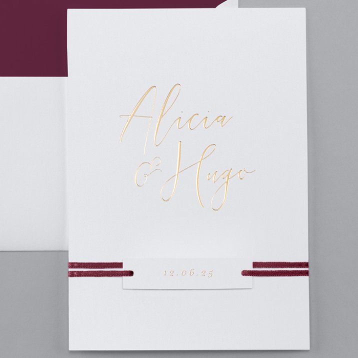 Trouwkaart in de vorm van een hoesje. Deze trouwkaart bevat 1 uitnodiging, 1 boekenlegger, 1 klein labeltje en 2 kleine kaartjes die je zelf kan personaliseren naargelang jullie wensen (dagprogramma, nuttige adressen, routebeschrijving, brunch voor de volgende ochtend...). De 3 kaartjes worden in de binnenkant van het hoesje geplaatst, afgesloten met een lintje naar keuze (extra te bestellen).