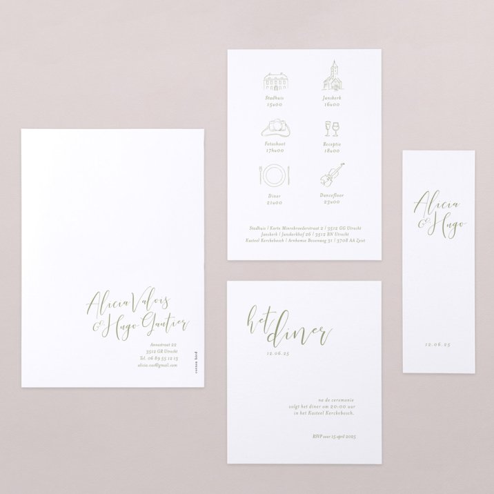 De save the date, binnenkant envelop voor jullie trouwkaart, stickers en het RSVP-kaartje.