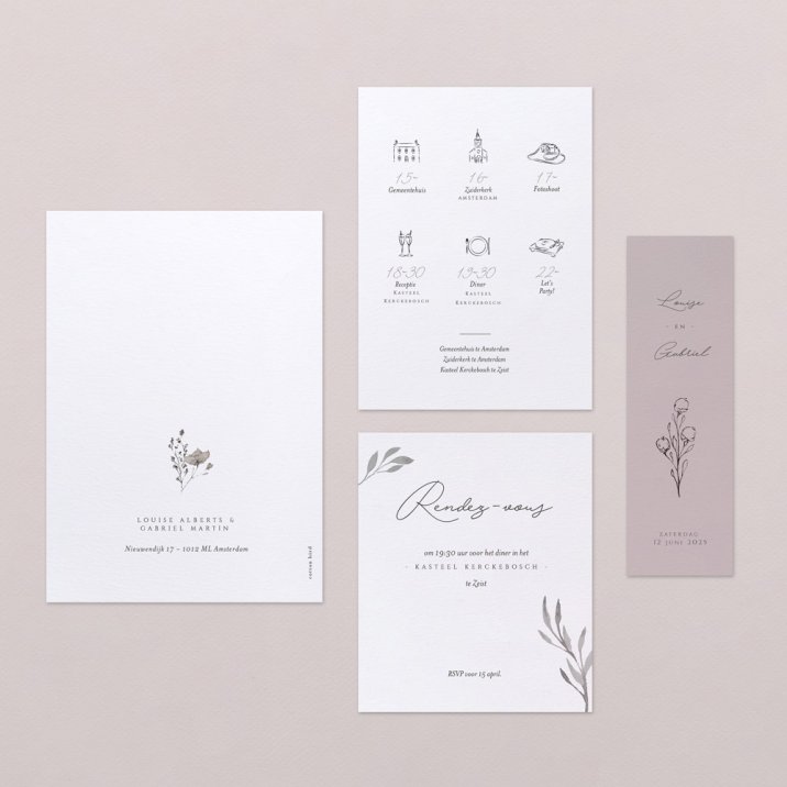 Trouwkaart in de vorm van een hoesje. Deze trouwkaart bevat 1 uitnodiging, 1 boekenlegger, 1 klein labeltje en 2 kleine kaartjes die je zelf kan personaliseren naargelang jullie wensen (dagprogramma, nuttige adressen, routebeschrijving, brunch voor de volgende ochtend...). De 3 kaartjes worden in de binnenkant van het hoesje geplaatst, afgesloten met een lintje naar keuze (extra te bestellen).