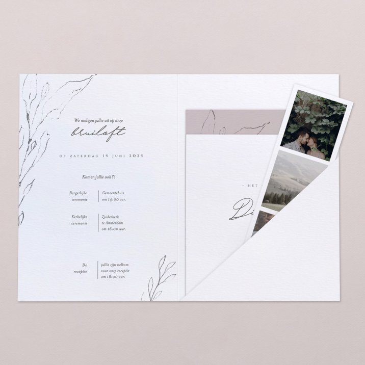 Deze trouwkaart bevat 1 uitnodiging, 1 fotostrip en 2 kleine kaartjes die online te bewerken zijn, als voorbeeld hierboven gepresenteerd als uitnodiging en het dagprogramma (maar jullie kunnen natuurlijk voor een heel andere tekst kiezen: hotellijst, planning, route, uitnodiging brunch voor de volgende ochtend...)