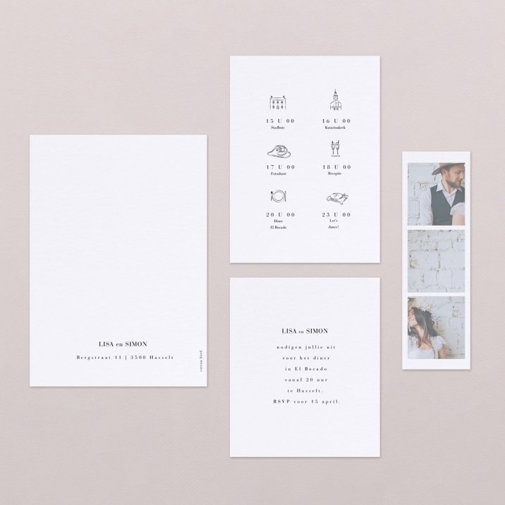 Deze trouwkaart bevat 1 uitnodiging, 1 fotostrip en 2 kleine kaartjes die online te bewerken zijn, als voorbeeld hierboven gepresenteerd als uitnodiging en het dagprogramma (maar jullie kunnen natuurlijk voor een heel andere tekst kiezen: hotellijst, planning, route, uitnodiging brunch voor de volgende ochtend...)