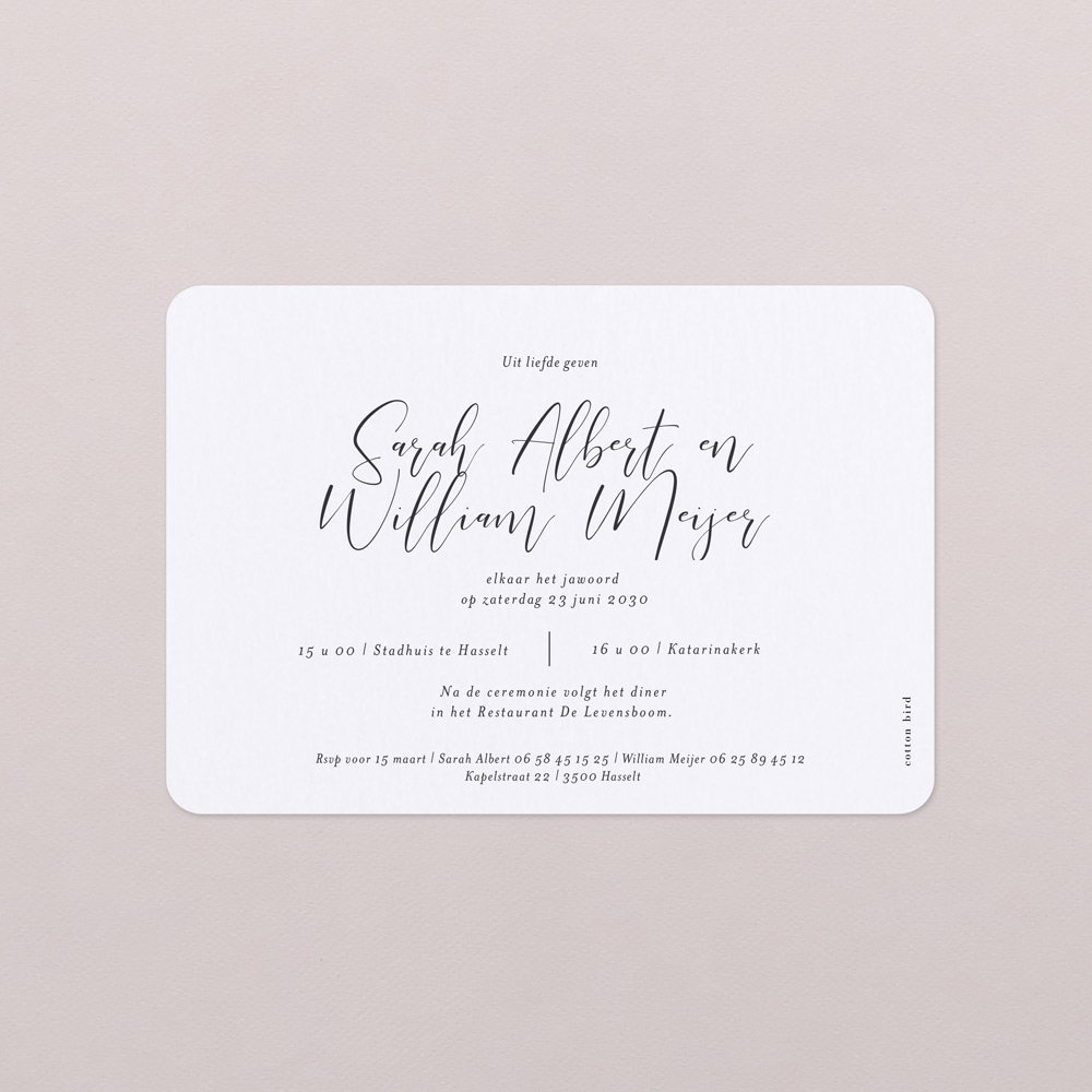 Eenvoudig en mooi - deze huwelijksuitnodiging in liggend formaat heeft zacht afgeronde hoeken en kan aan beide zijden worden gepersonaliseerd. Ontdek de envelop liner en stickers in hetzelfde design van de trouwkaart.