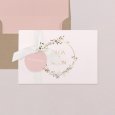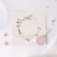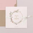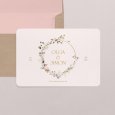 Ingeschreven in het hart van een delicate bloemenkrans staan jullie namen centraal op de trouwkaart Giuseppa. Een model met gouden details dat de toon zet voor een bohemien-chique bruiloft.