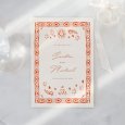 Op de Stella trouwkaart staan de namen van het aanstaande bruidspaar in het hart van een lijst met poëtische sterren en schetsen van het heelal. Dit moderne drukwerk in terracotta tonen is perfect om een schitterende zomerbruiloft aan te kondigen.